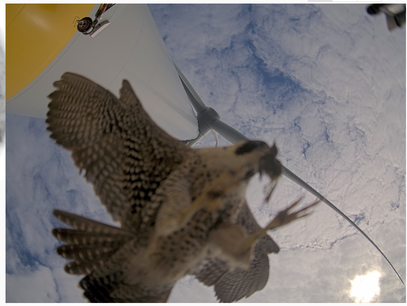 Foraging was the most common behavior (n = 596 detections) observed in 21 bird species/groups and two bat species groups. Aerial foraging was the most frequently observed foraging type (n = 463), followed by hawking (n = 104), and monopole gleaning (n = 29). Peregrine falcons were seen patrolling the turbines for prey frequently during the fall.
